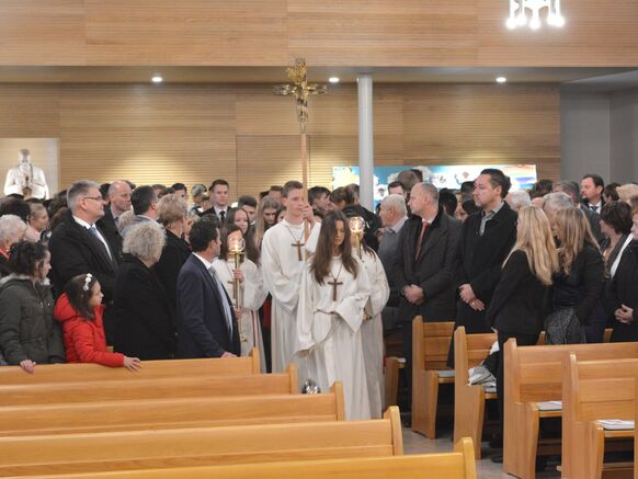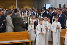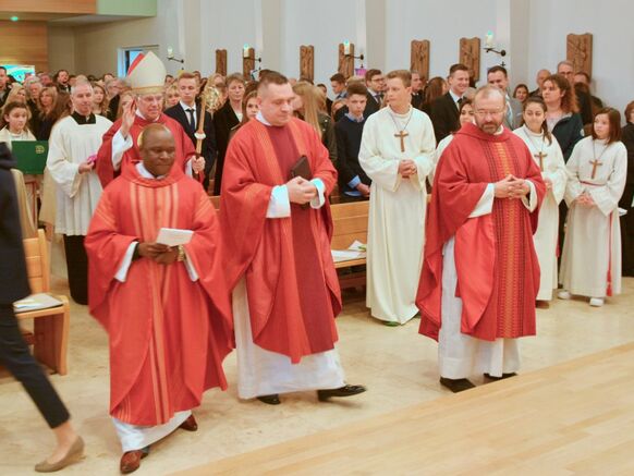 „Ein volles Haus“ erwartete Weihbischof Dietz, Pfarrer Heldmann, Pfarrer Jünemann und Pfarrer Mambu mitsamt Ministranten, Firmbewerbern und deren Paten beim Einzug in die Kirche Sankt Familia. Viele Familienangehörige und Freunde von nah und fern hatten sich hier versammelt, um diesen wichtigen Schritt auf dem Glaubensweg mit den Firmanden zu teilen.