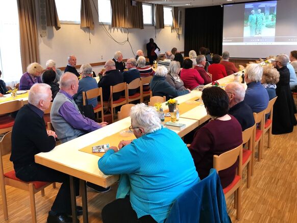 Pfr. Mambu präsentierte nach dem Gottesdienst im gut besetzten Don-Bosco-Haus bildreiche Informationen aus seiner Heimatgemeinde, u.a. über den dortigen Neubau der Kirche „St. Johannes-Paul II“, die den 10.000 ortsansässigen Katholiken ortsnah die Möglichkeit bietet, zusammen zu beten und den Gottesdienst zu feiern.