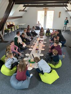 Am Wochenende vom 24. bis zum 26. März fand das Kommunionwochenende der Pfarrei St. Familia, Bruchköbel in Hilders in der Rhön statt. Florian Peter Schmelzeisen, Praktikant der Pfarrei, berichtet: „Ich durfte gemeinsam mit den Katechetinnen, Pfarrer Alexander Best, Gemeindereferentin Johanna Elm und unseren 19 Kommunionkindern ein Wochenende voller spannender Ereignisse planen, vorbereiten und durchführen. Das Wochenende drehte sich um die Themen Gründonnerstag, Karfreitag und Ostern. Das Pessachmahl und dessen Zusammenhang mit dem letzten Abendmahl wurde dabei ausführlich und erlebbar thematisiert. Ich fand den Spaziergang durch die Landschaft, den wir am Samstagnachmittag unternahmen, sehr schön. Dabei hatte ich den Eindruck, dass die Kinder von den unterschiedlichen Witterungsbedingungen - vor allem von dem starken Wind und dem Schnee - begeistert waren. Als unser Pfarrer vom Exodus, dem Auszug der Israeliten aus Ägypten, erzählte, hörten die Kinder fasziniert und gespannt zu. Nach vielen Erlebnissen sind wir mit neuen Erfahrungen und großartigen Eindrücken wieder in Bruchköbel angekommen.“